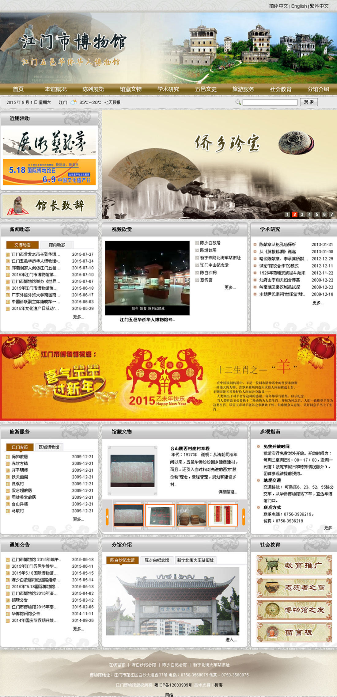 江门市博物馆又名五邑华侨华人博物馆,是一所国有地级综合性博物馆,隶属广东省江门市文化广电新闻出版局。1985年5月,江门市博物馆正式成立,为政府常设的专业文物管理机构,馆址定在陈白沙纪念馆内并对陈白沙纪念馆进行管理。多年以来,江门市博物馆的工作和成果得到了社会各界的肯定和支持,2013年被评为国家二级博物馆,被授予“全国青少年教育基地”、“中华文化传承基地”、“广东省爱国主义教育基地”、“广东侨乡文化研究中心”、“全国社会科学普及教育基地”等一系列荣誉称号。