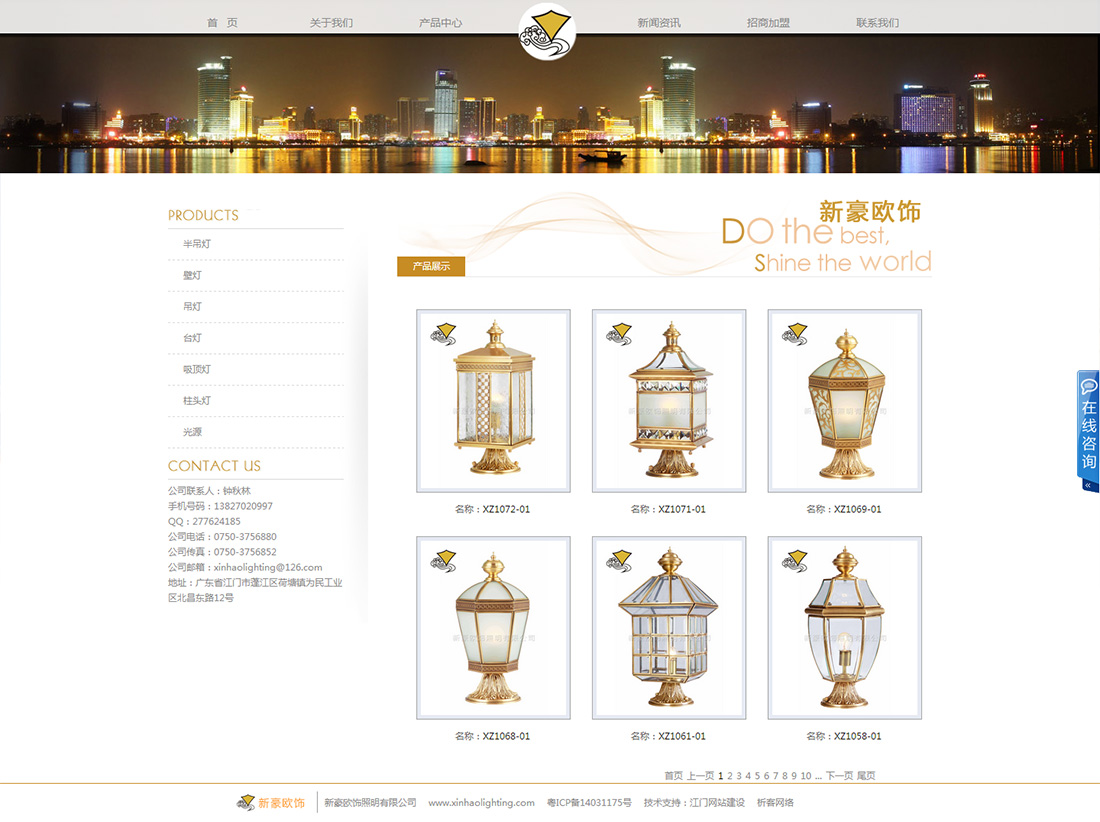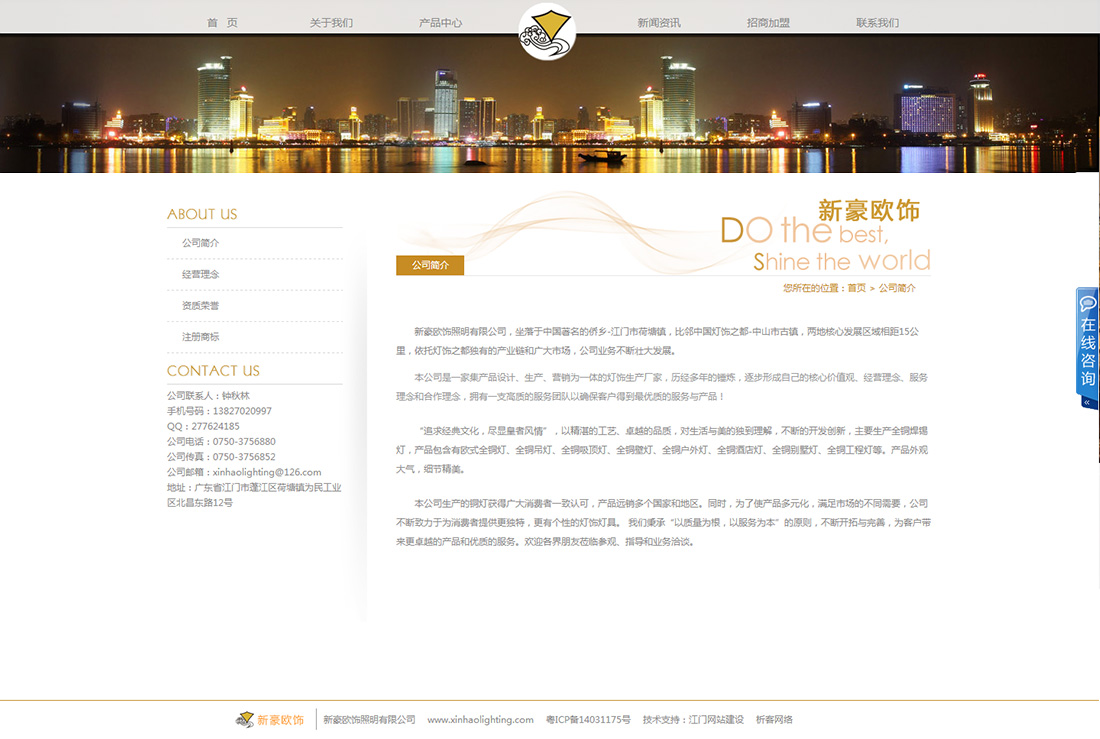 新豪欧饰照明有限公司,坐落于中国著名的侨乡-江门市荷塘镇,比邻中国灯饰之都-中山市古镇,两地核心发展区域相距15公里,依托灯饰之都独有的产业链和广大市场,公司业务不断壮大发展。本公司生产的铜灯获得广大消费者一致认可,产品远销多个国家和地区。同时,为了使产品多元化,满足市场的不同需要,公司不断致力于为消费者提供更独特,更有个性的灯饰灯具。 我们秉承“以质量为根,以服务为本”的原则,不断开拓与完善,为客户带来更卓越的产品和优质的服务。欢迎各界朋友莅临参观、指导和业务洽谈。