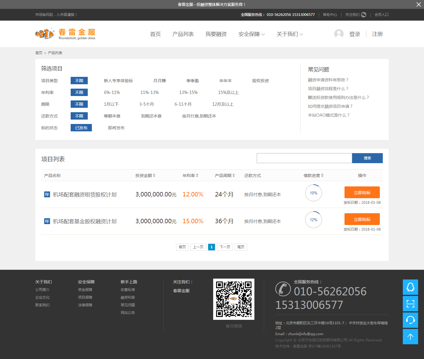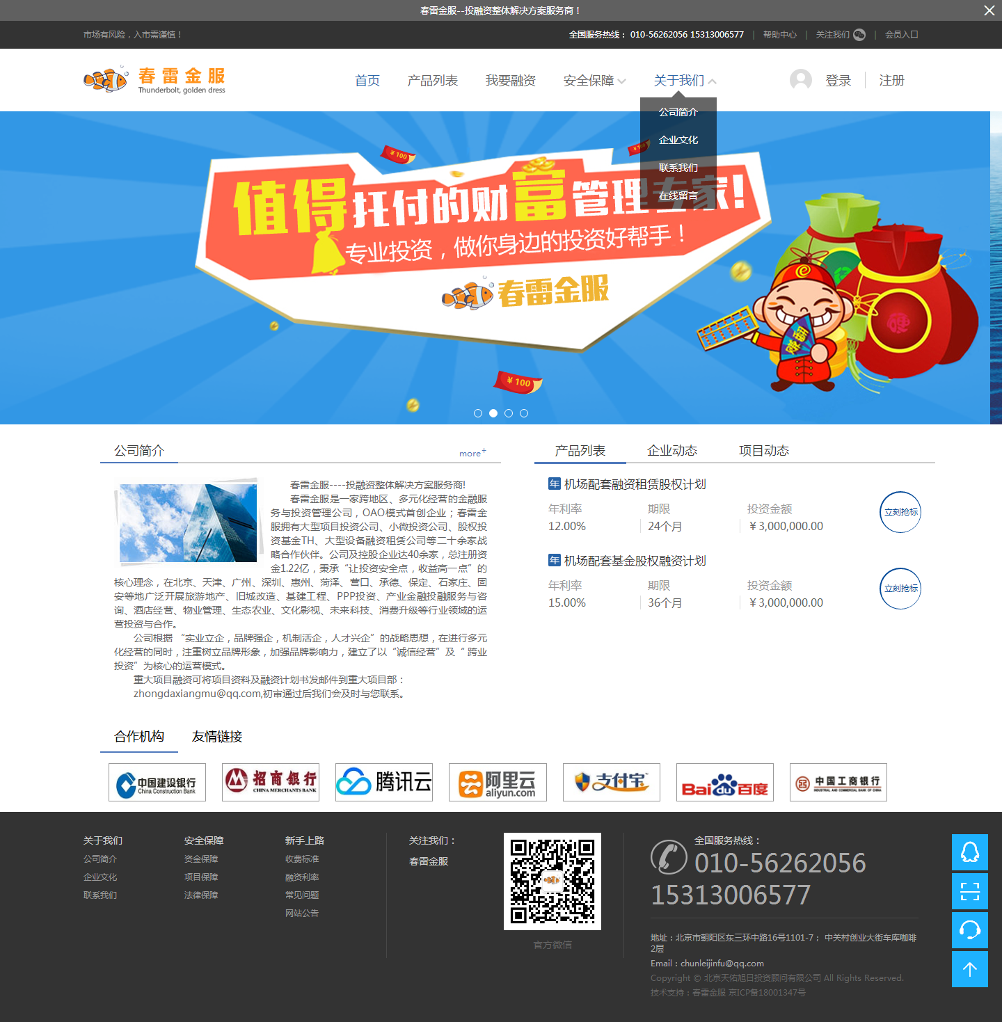 春雷金服是一家跨地区、多元化经营的金融服务与投资管理公司,OAO模式首创企业;春雷金服拥有大型项目投资公司、小微投资公司、股权投资基金TH、大型设备融资租赁公司等二十余家战略合作伙伴。公司及控股企业达40余家,总注册资金1.22亿,秉承“让投资安全点,收益高一点”的核心理念,在北京、天津、广州、深圳、惠州、菏泽、营口、承德、保定、石家庄、固安等地广泛开展旅游地产、旧城改造、基建工程、PPP投资、产业金融投融服务与咨询、酒店经营、物业管理、生态农业、文化影视、未来科技、消费升级等行业领域的运营投资与合作。