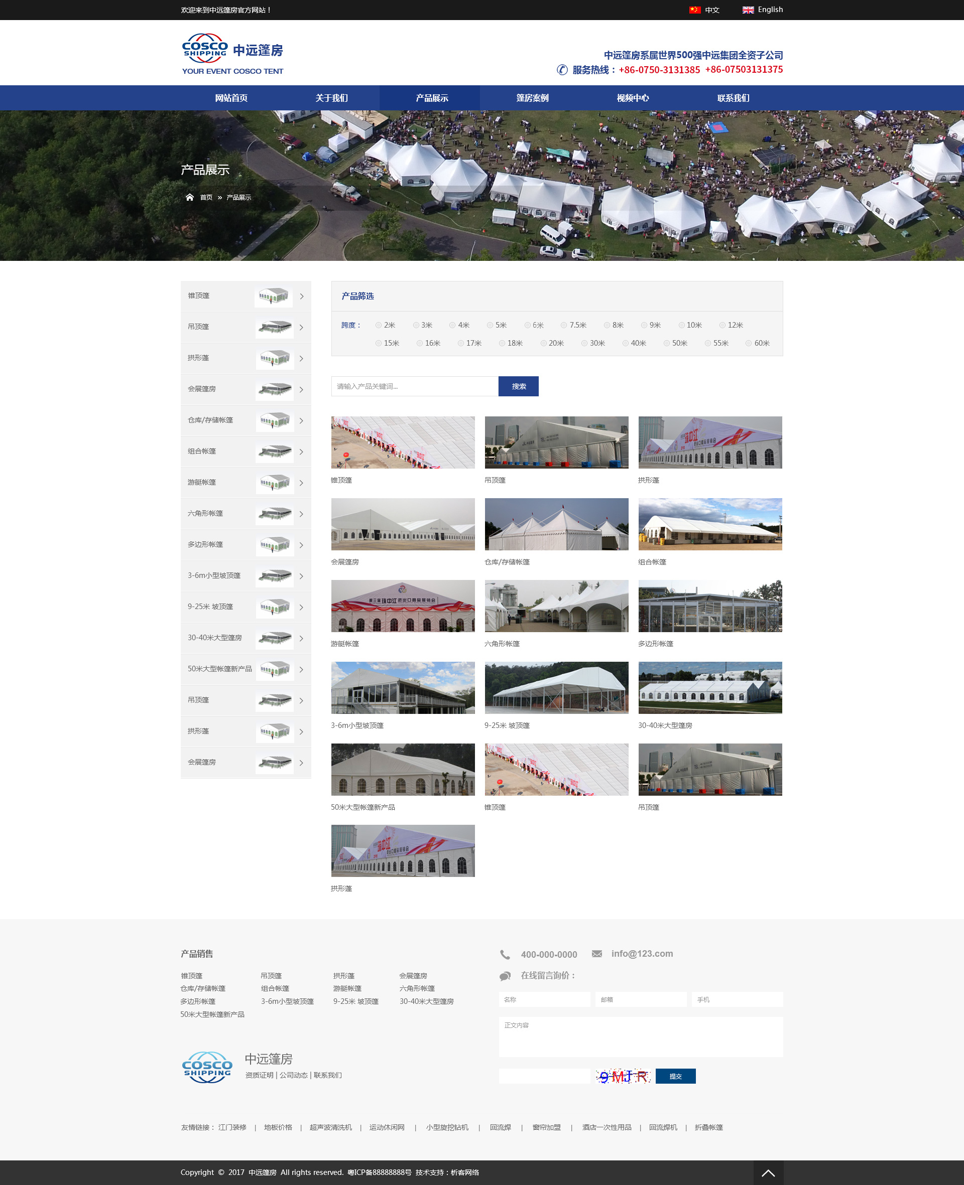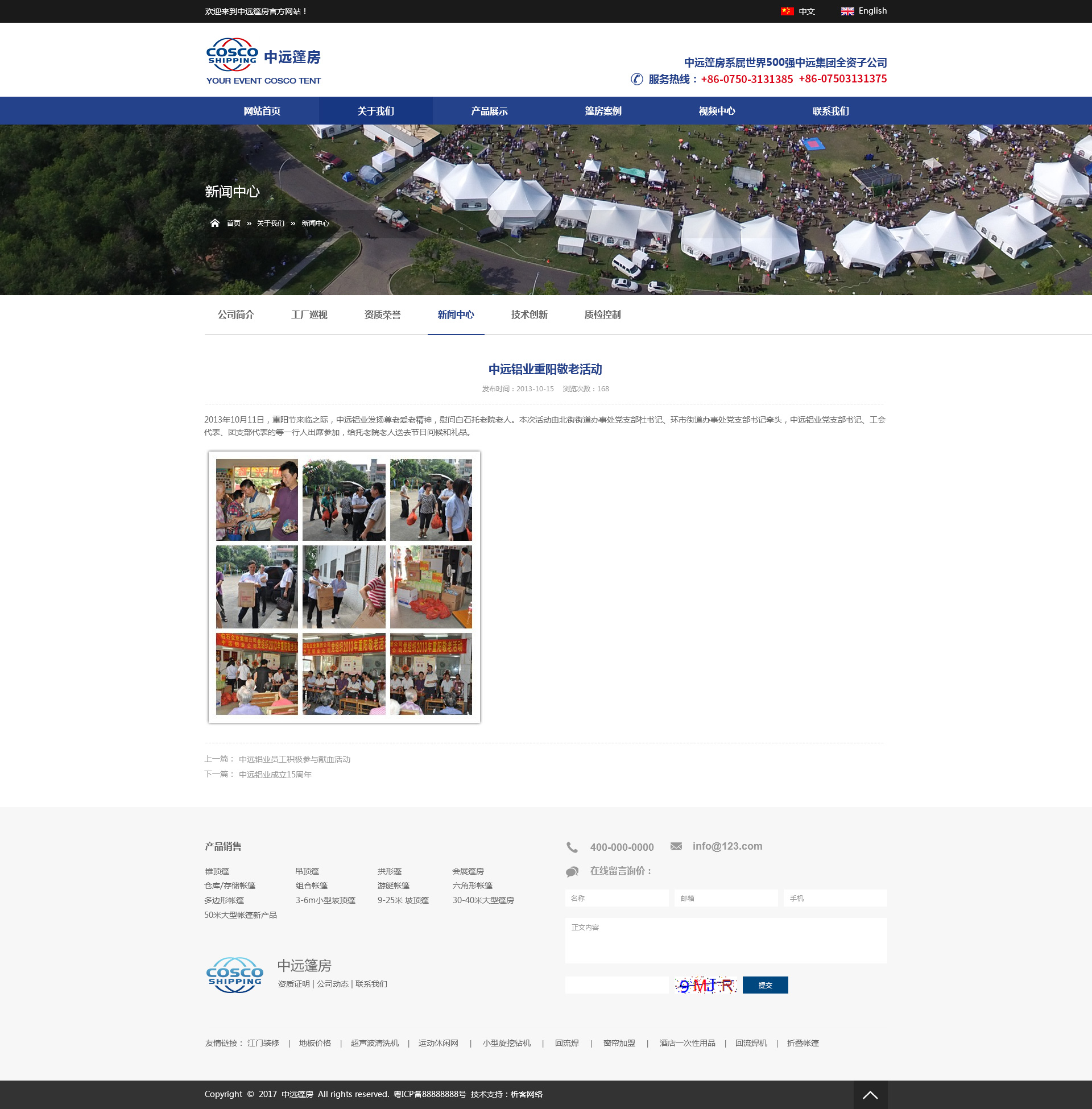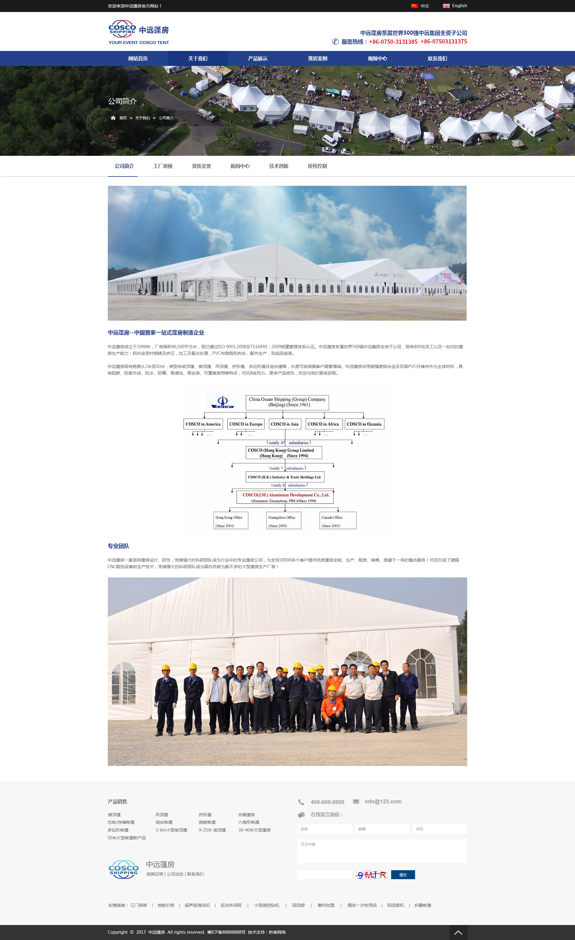 中远篷房成立于1998年,厂房面积46,500平方米,现已通过ISO 9001:2008及TS16949:2009质量管理体系认证。中远篷房系属世界500强中远集团全资子公司,现有800名员工以及一站式的篷房生产能力:铝合金型材熔铸及挤压,加工及氧化处理,PVC布裁剪和热合,配件生产,到成品组装。