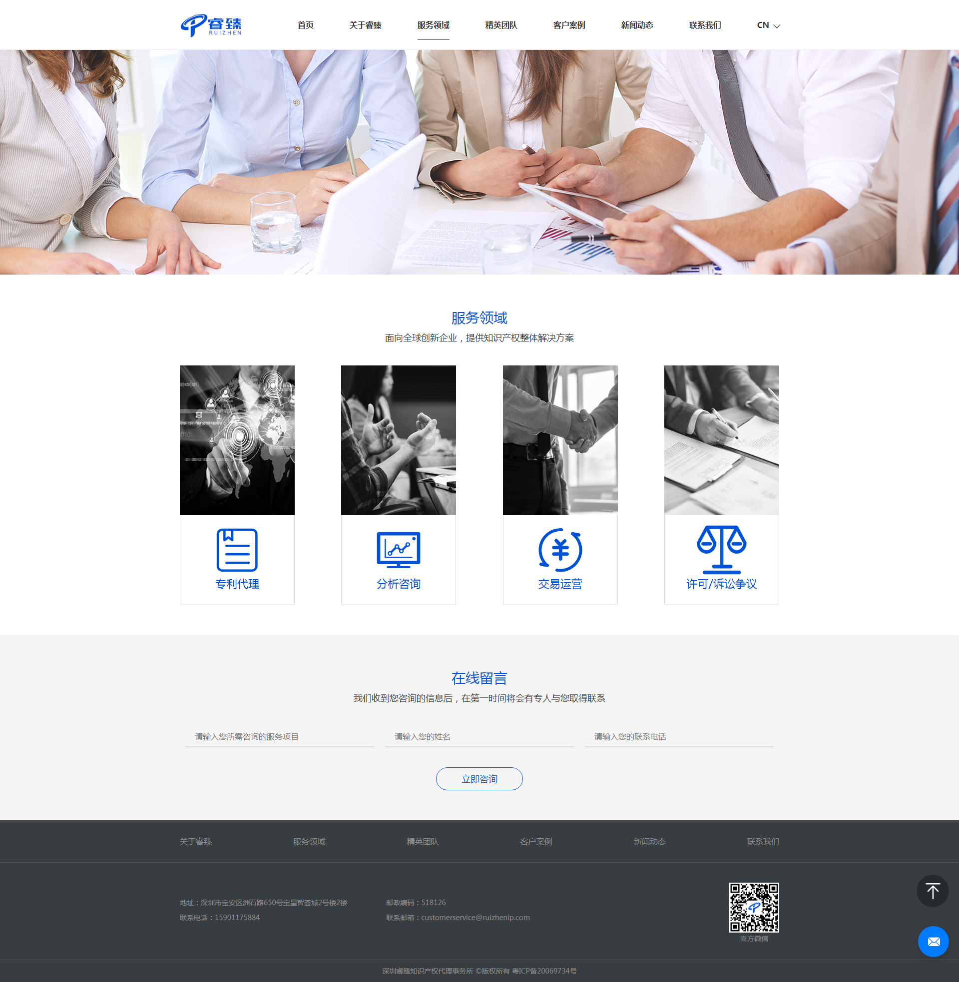 睿臻知识产权业务覆盖知识产权服务全价值链,构建起专业、高效、创新、规范的知识产权服务体系。公司总部设于深圳,在北京、上海设有分支机构,正积极布局欧美、日本、韩国和以色列等全球创新活动和知识产权运营活跃的国家和地区。