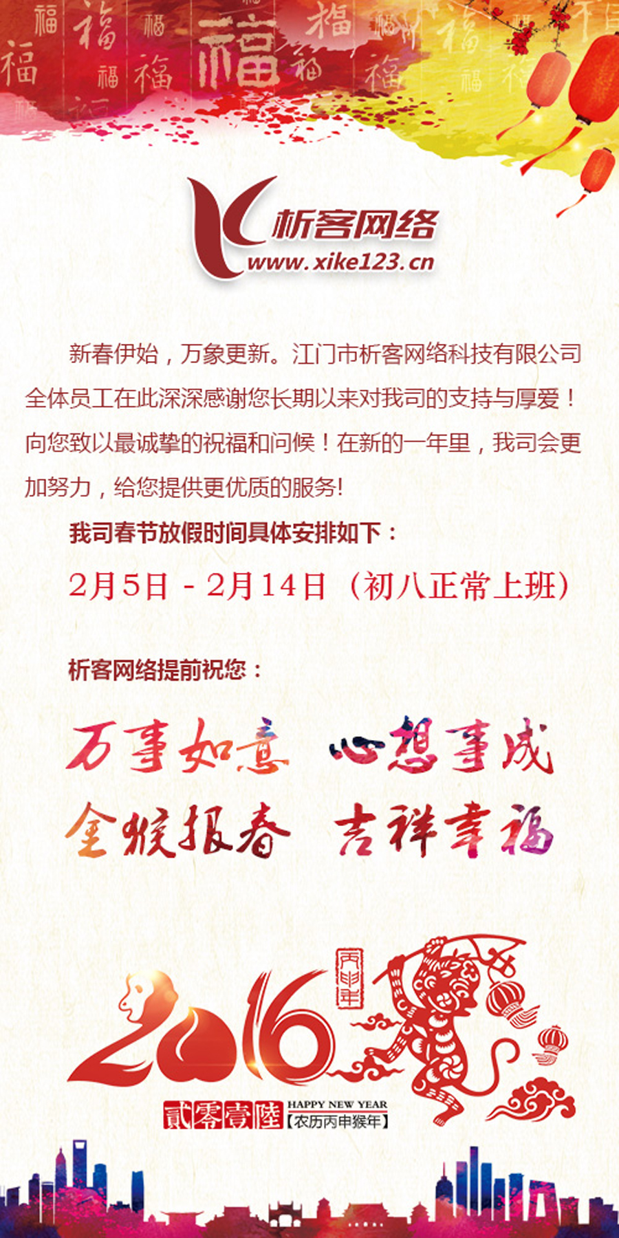 在春节期间如您有任何问题欢迎拨打400-099-2093或0750-3219990我们的客服热线寻求帮助,或者直接致电您的业务人员,我们将以最热诚的态度为您服务!析客网络全体仝人恭祝您猴年大吉,万事胜意!