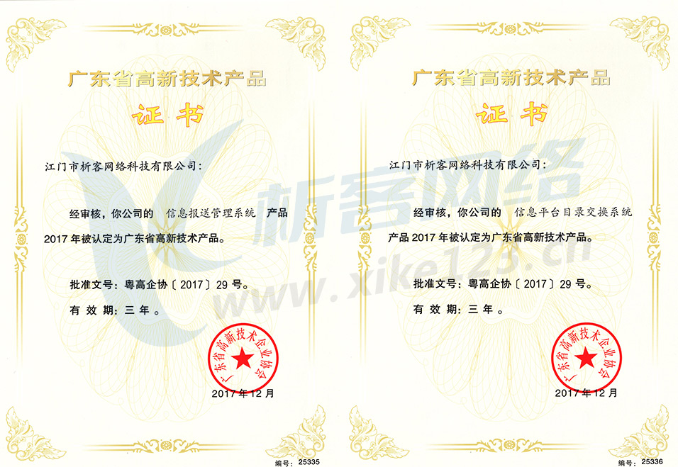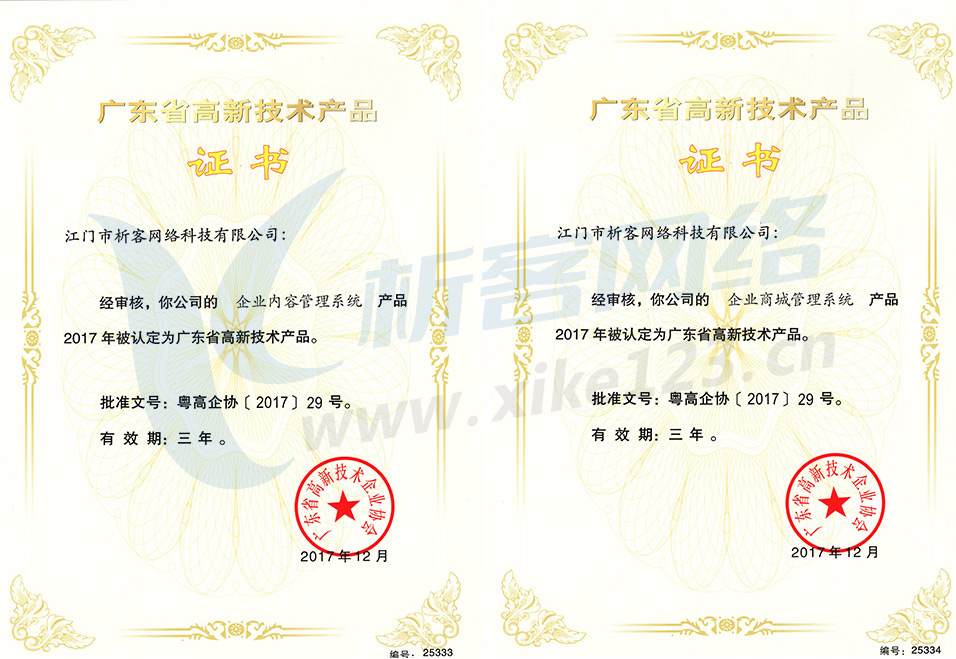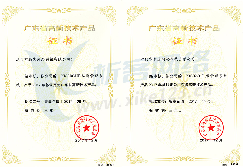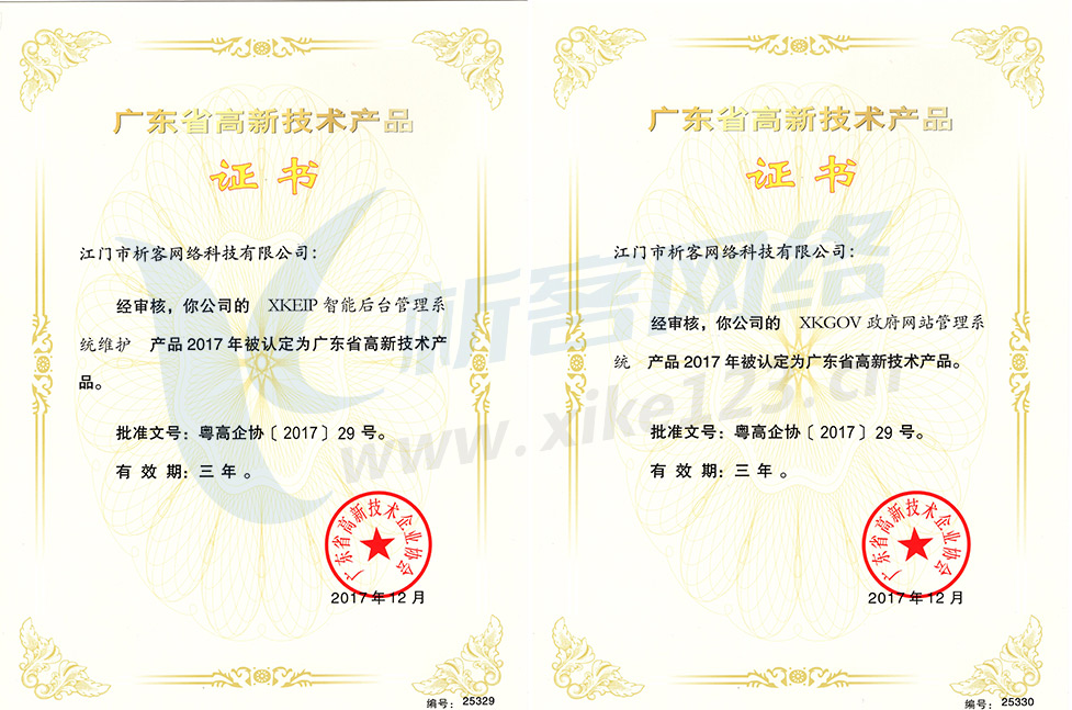 祝贺析客网络XIEIP智能后台管理系统维护、XKGOV政府网站管理系统、XKGROUP站群管理系统、XKO2O门店管理系统、企业内容管理系统、企业商城管理系统、信息报送管理系统、信息平台目录交换系统,八项自主知识产权产品2017年被认定为广东省高新技术产品。