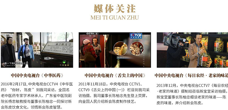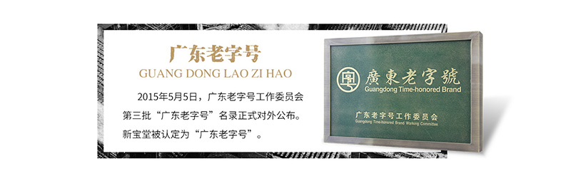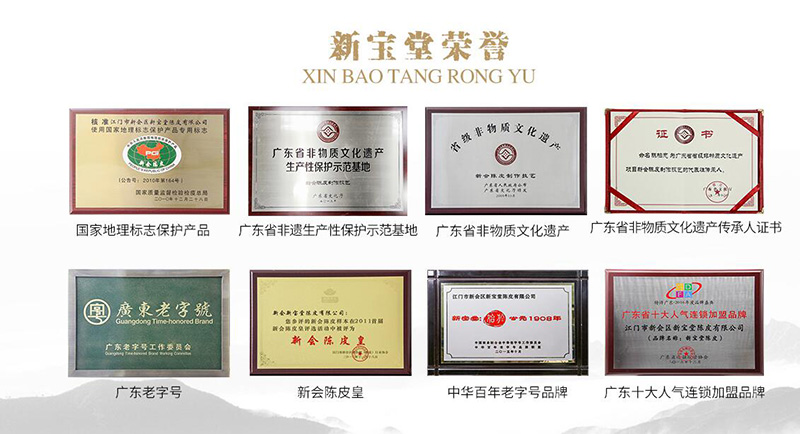 新宝堂创立于1908年,是一家有108年历史的“广东老字号”企业,是广东省非物质文化遗产“新会陈皮制作技艺”传承人单位和省级非物质文化遗产生产性保护示范基地。现已发展成集新会柑种植基地、原材料批发、食品研发深加工、连锁专卖店和电子商务、生物科技于一体的新会陈皮开发企业。