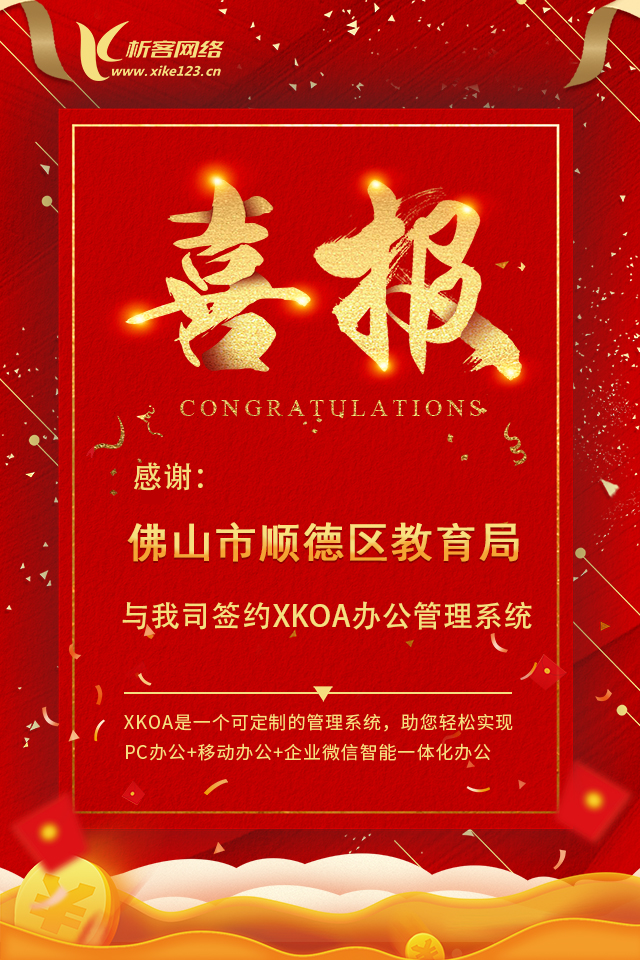 经过多次详细沟通,双方一致达成协议,确定XKOA办公系统解决方案。目前佛山市顺德区教育局已经和我司签订签订XKOA办公管理系统合同,并进入项目启动阶段。