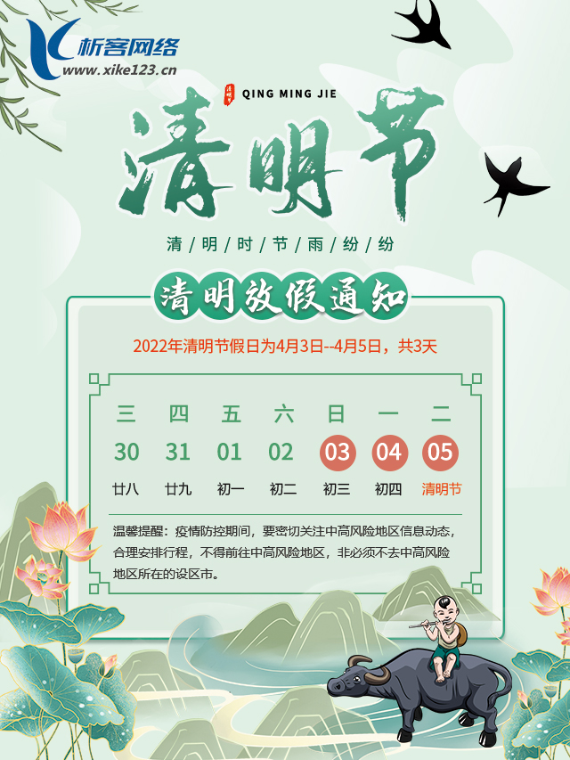 析客网络清明放假时间为:4月3日至5日,6日正常上班。