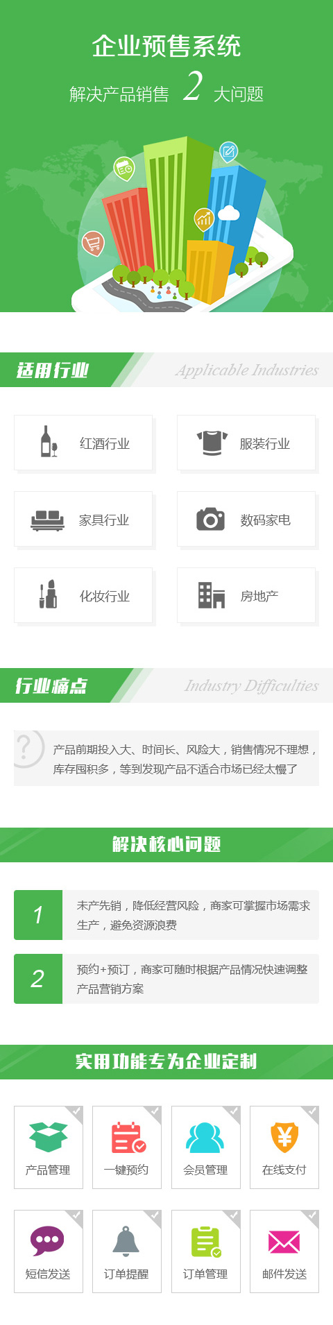 产品管理、一键预约、会员管理、在线支付、短信发送、订单提醒、订单管理、邮件发送