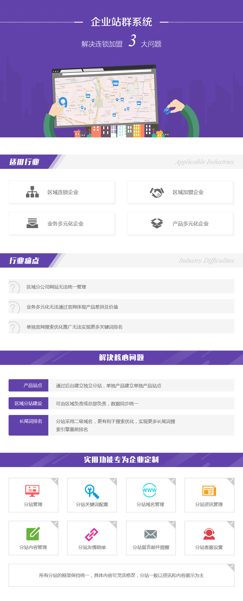 分站管理、分站关键词配置、分站域名管理、分站资讯管理、分站内容管理、分站友情链接、分站留言邮件提醒、分站客服设置