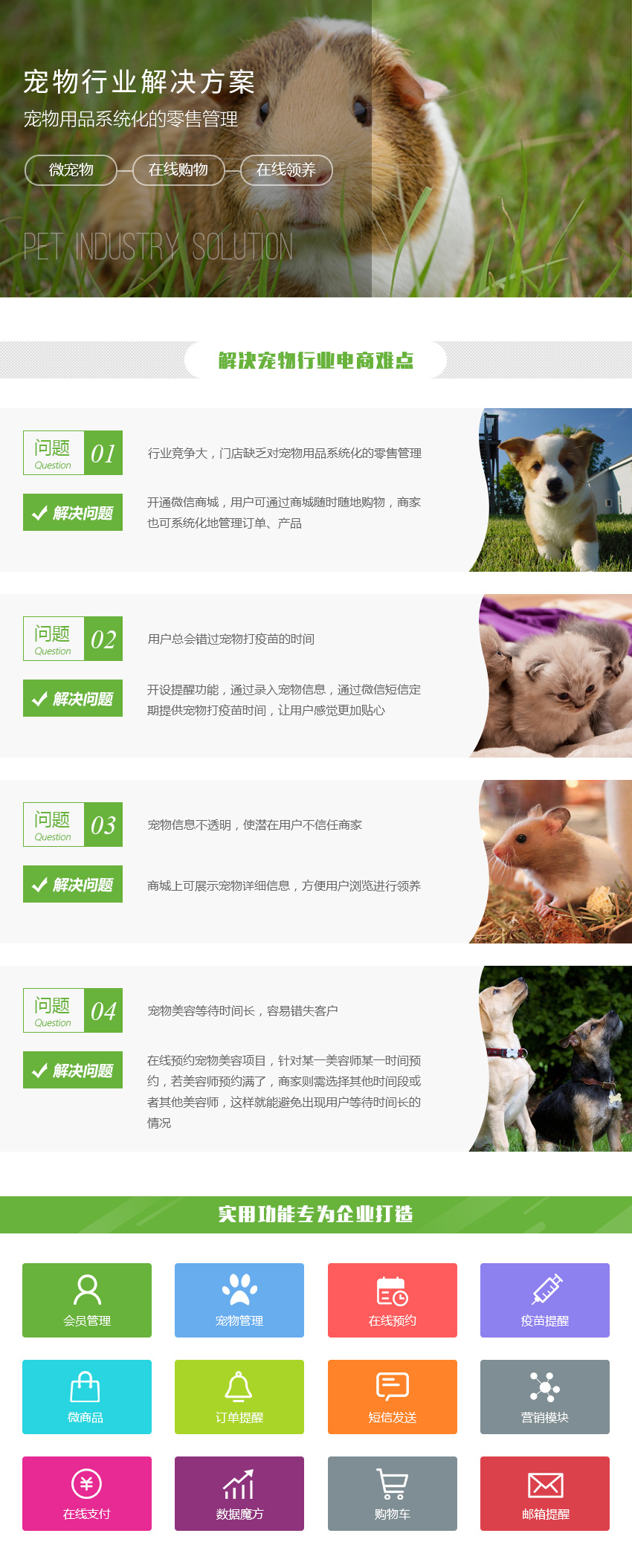 会员管理、宠物管理、微商品、疫苗提醒、在线预约、订单提醒、短信发送、营销模块、数据魔方、在线支付、购物车、邮箱提醒