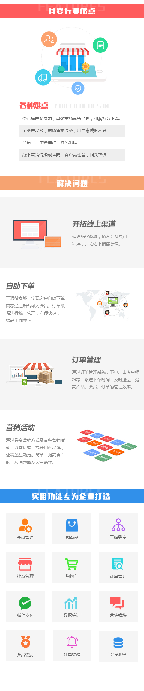 开通微商城,实现客户自助下单,商家通过后台可对会员、订单数据进行统一管理,方便快捷,提高工作效率。