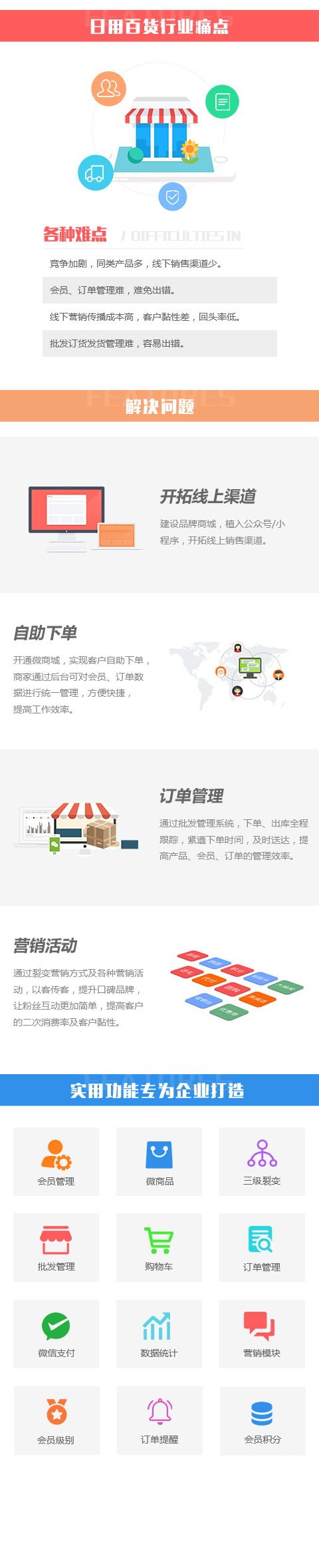 开通微商城,实现客户自助下单,商家通过后台可对会员、订单数据进行统一管理,方便快捷,提高工作效率。