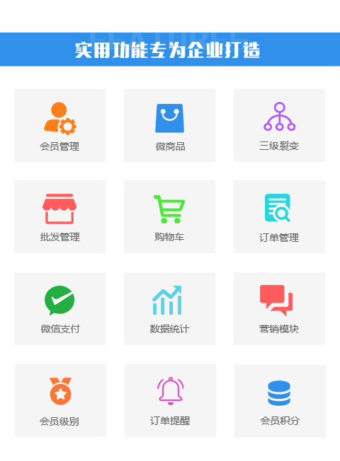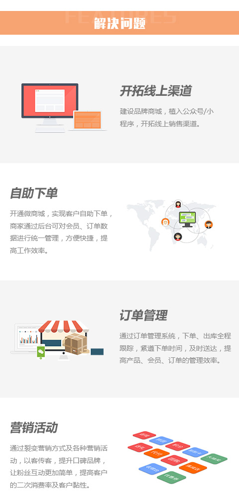 开通微商城,实现客户自助下单,商家通过后台可对会员、订单数据进行统一管理,方便快捷,提高工作效率。