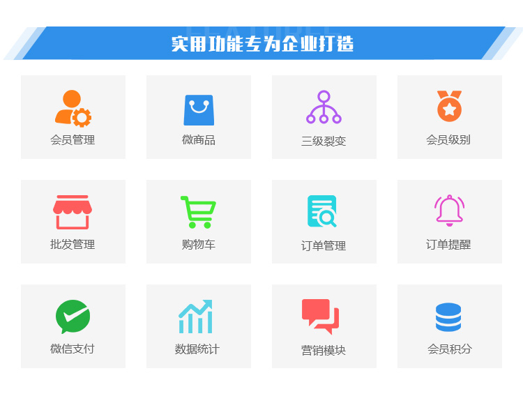 开通微商城,实现客户自助下单,商家通过后台可对会员、订单数据进行统一管理,方便快捷,提高工作效率。