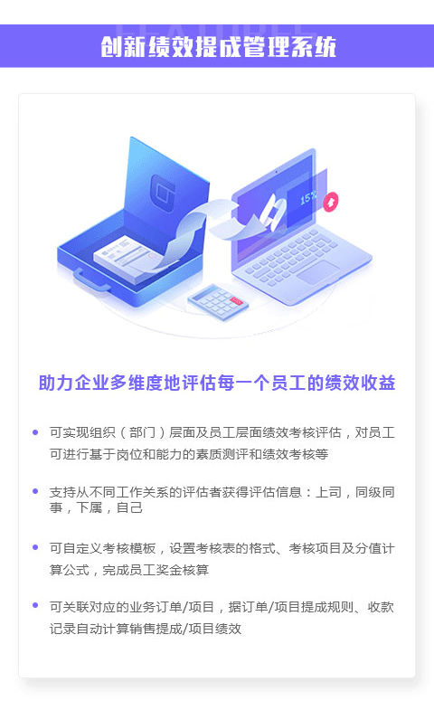 可关联对应的业务订单/项目,据订单/项目提成规则、收款记录自动计算销售提成/项目绩效