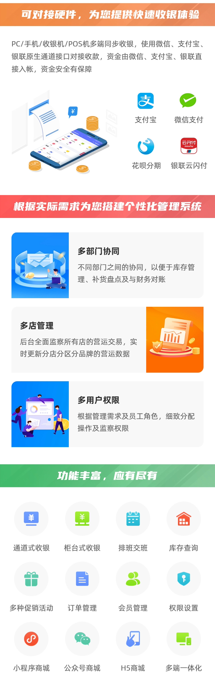 PC/手机/收银机/POS机多端同步收银,使用微信、支付宝、银联原生通道接口对接收款,资金由微信、支付宝、银联直接入帐,资金安全有保障