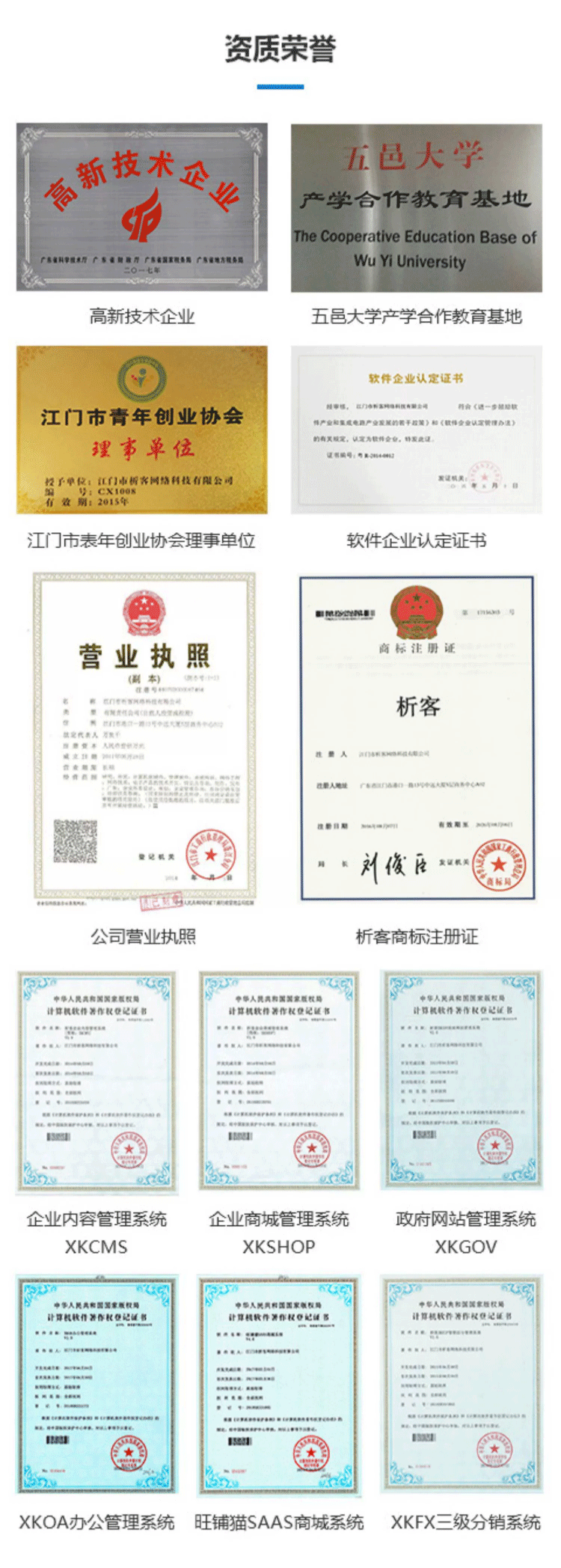 析客网络科技有限公司创立于2008年,是一家信息化高新技术企业,致力于帮助企业接入互联网,助力企业数字化发展,实现对内对外的信息化经营。旗下自主研发产品包含XKCMS(云官网)、XKSHOP(云商城)、XKOA(移动办公)、XKERP(ERP管理系统)、XKGOV(云政务)、XK+(行业解决方案)、旺铺猫SAAS商城, 均可结合客户实际需求进行定制开发,已为上万家企事业单位提供网站信息化服务。