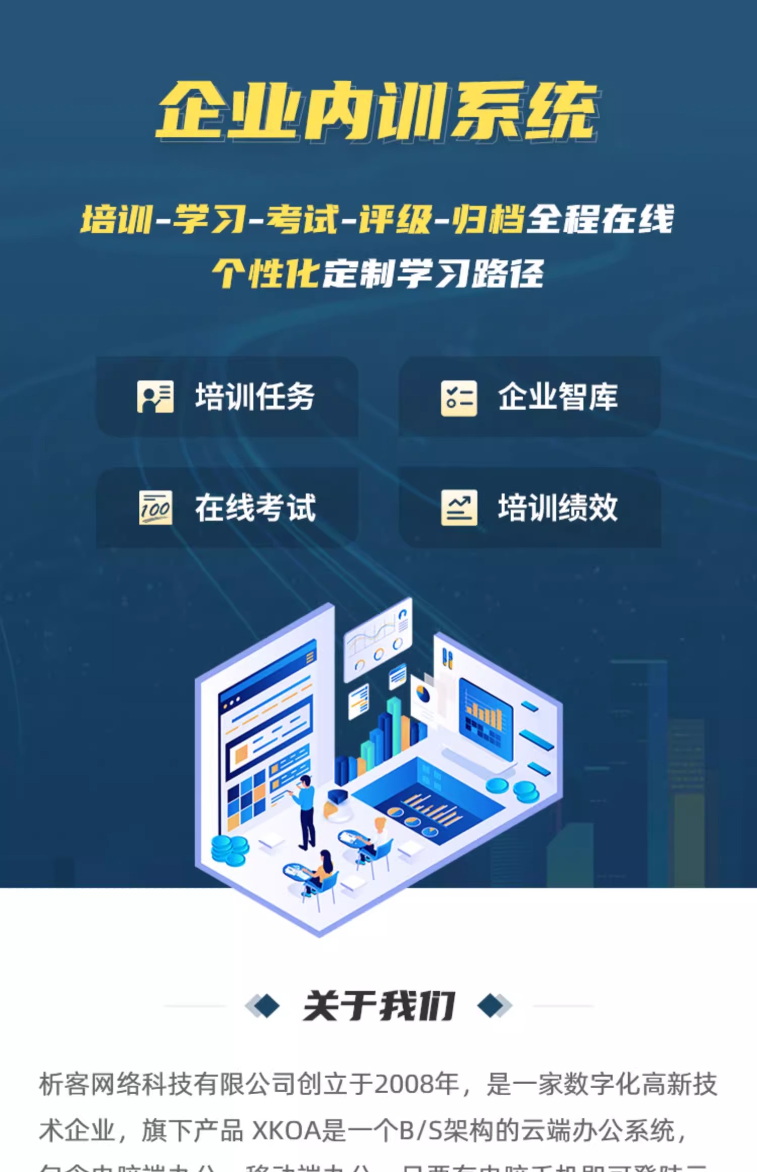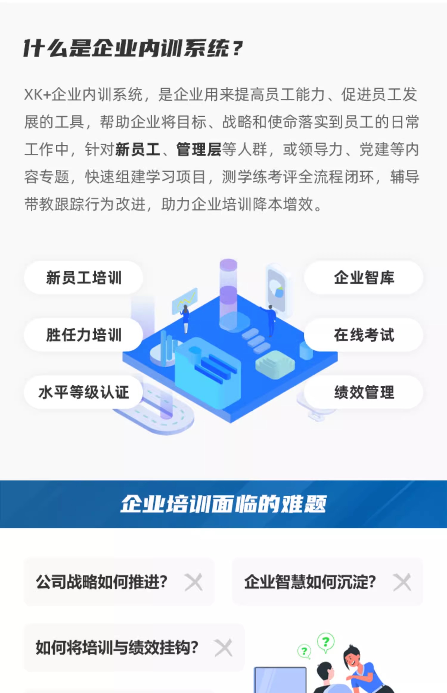 XK+企业内训系统,是企业用来提高员工能力、促进员工发展的工具,帮助企业将目标、战略和使命落实到员工的日常工作中,针对新员工、管理层等人群,或领导力、党建等内容专题,快速组建学习项目,测学练考评全流程闭环,辅导带教跟踪行为改进,助力企业培训降本增效。