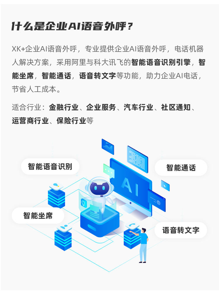 XK+企业AI语音外呼,专业提供企业AI语音外呼,电话机器人解决方案,采用阿里与科大讯飞的智能语音识别引擎,智能坐席,智能通话,语音转文字等功能,助力企业AI电话,节省人工成本。