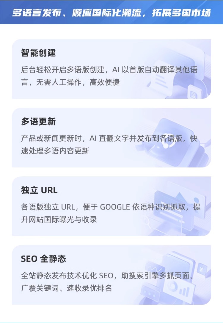 采用全站静态发布技术,优化 SEO 效果。助力搜索引擎轻松抓取更多页面,广泛覆盖关键词,快速收录并提升网站排名,让您的网站在国际搜索结果中脱颖而出,吸引更多潜在客户,为业务增长注入强劲动力。