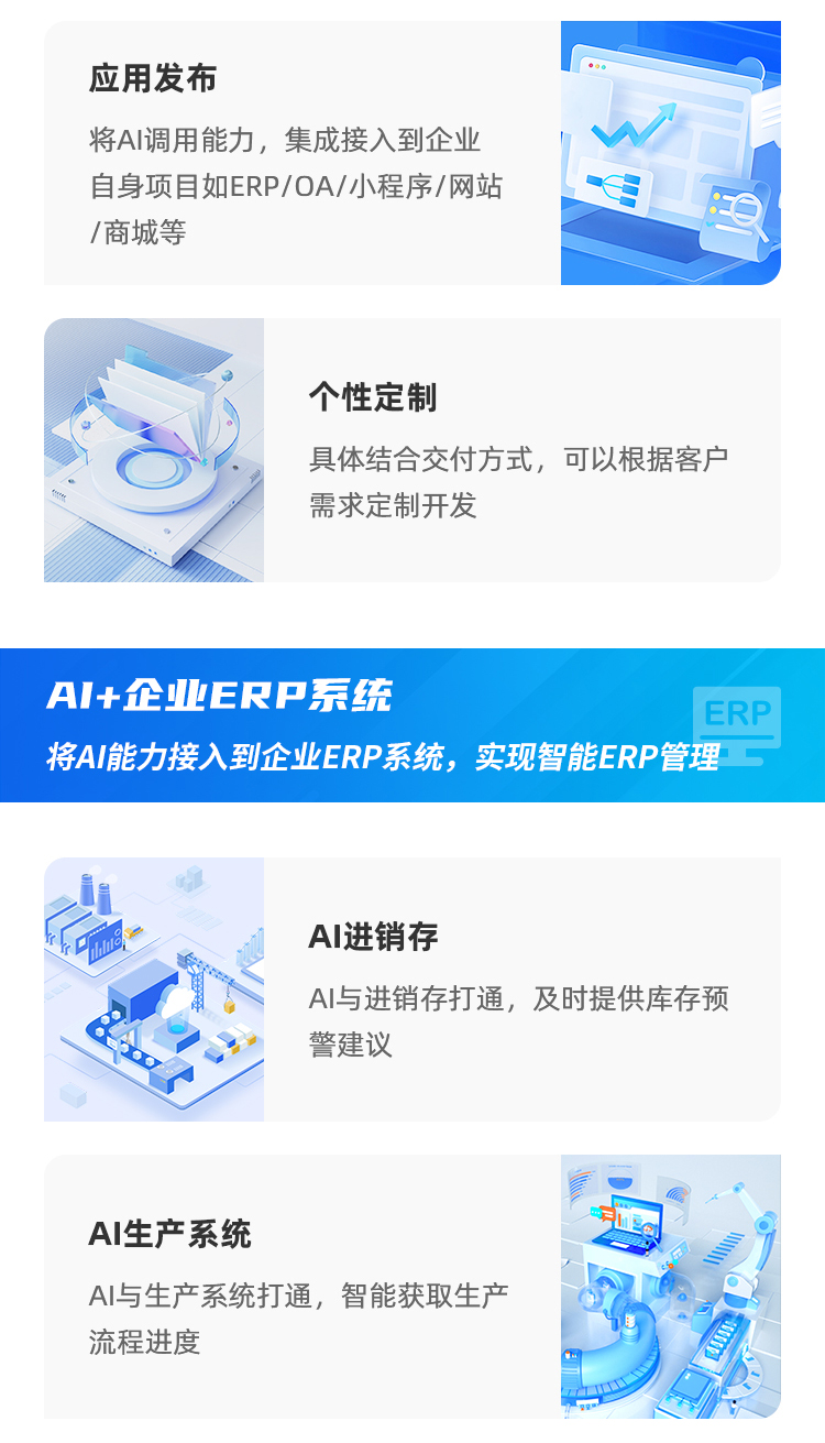 l 应用发布:将AI调用能力,集成接入到企业自身项目如ERP/OA/小程序/网站/商城等;