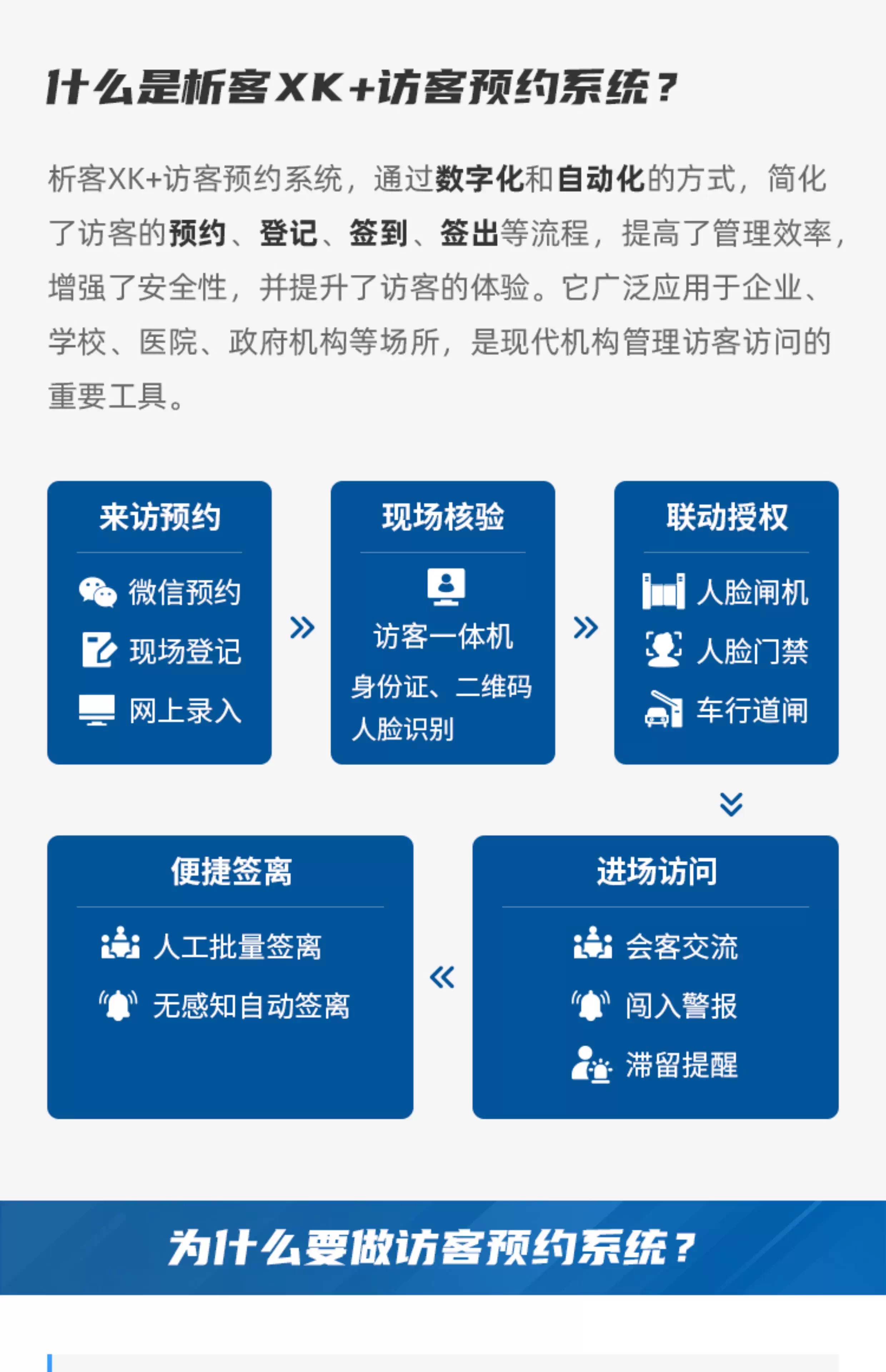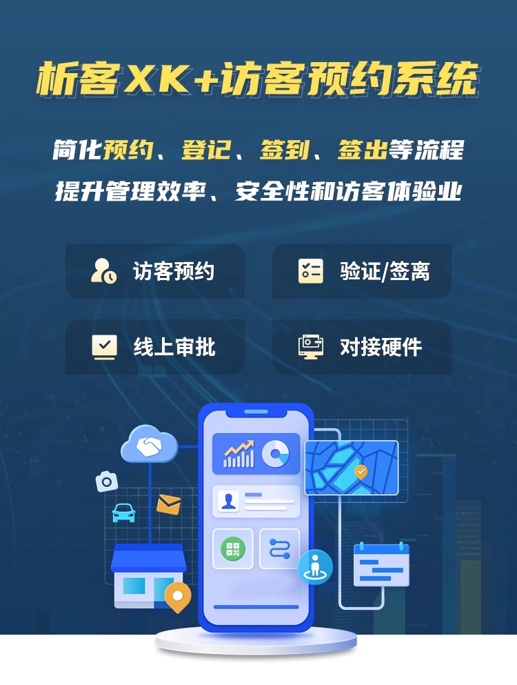 析客XK+访客预约系统,通过数字化和自动化的方式,简化了访客的预约、登记、签到、签出等流程,提高了管理效率,增强了安全性,并提升了访客的体验。它广泛应用于企业、学校、医院、政府机构等场所,是现代机构管理访客访问的重要工具。