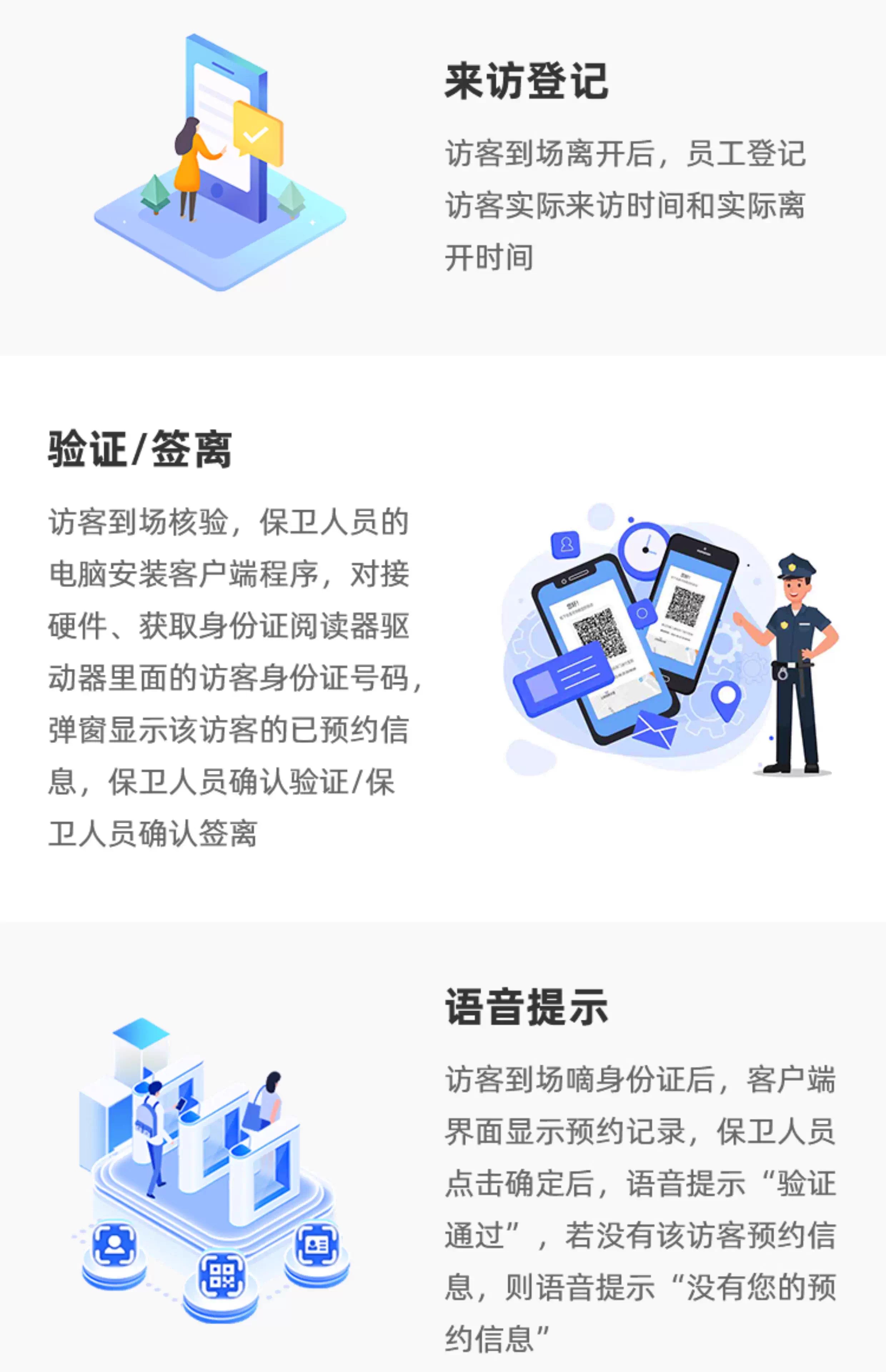 访客到场核验,保卫人员的电脑安装客户端程序,对接硬件、获取身份证阅读器驱动器里面的访客身份证号码,弹窗显示该访客的已预约信息,保卫人员确认验证/保卫人员确认签离