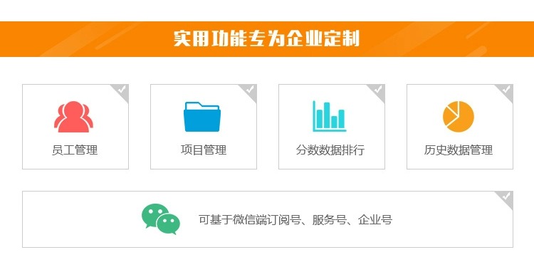 员工管理、项目管理、分数数据排行、历史数据管理、可基于微信端订阅号、服务号、企业号