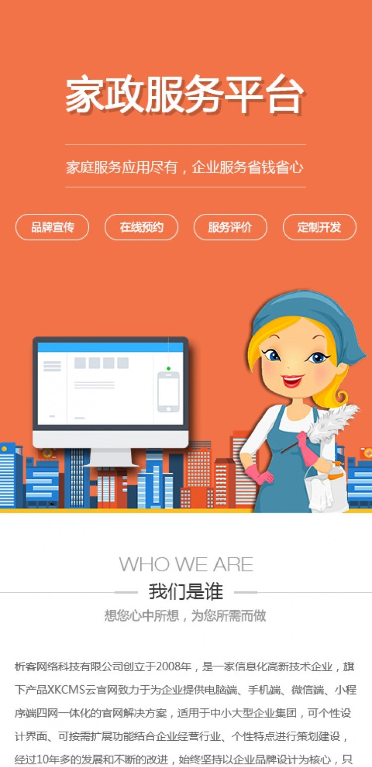 1、信息化问题:展示公司信息,用户可随时随地可查看订单信息、进度和服务报价,包装品牌,网站后台管理订单、服务员工,节省人力,提高工作效率。