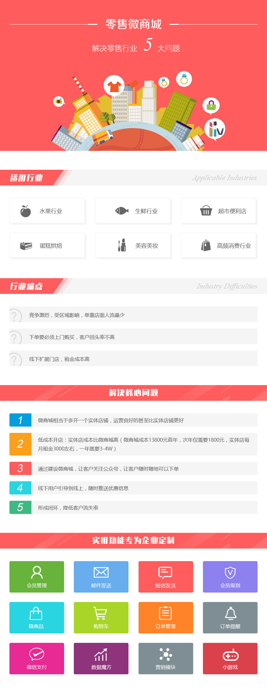 会员管理、邮件发送、短信发送、会员级别、微商品、购物车、订单管理、订单提醒、微信支付、数据魔方、营销模块、小游戏