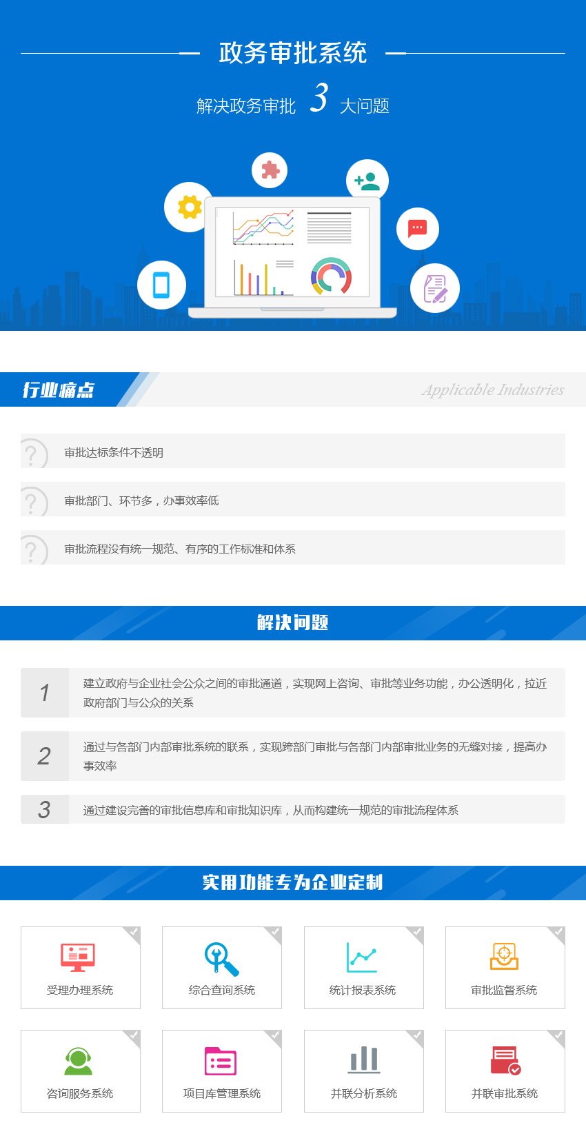 受理办理系统、综合查询系统、统计报表系统、审批监督系统、咨询服务系统、项目库管理系统、并联分析系统、并联审批系统