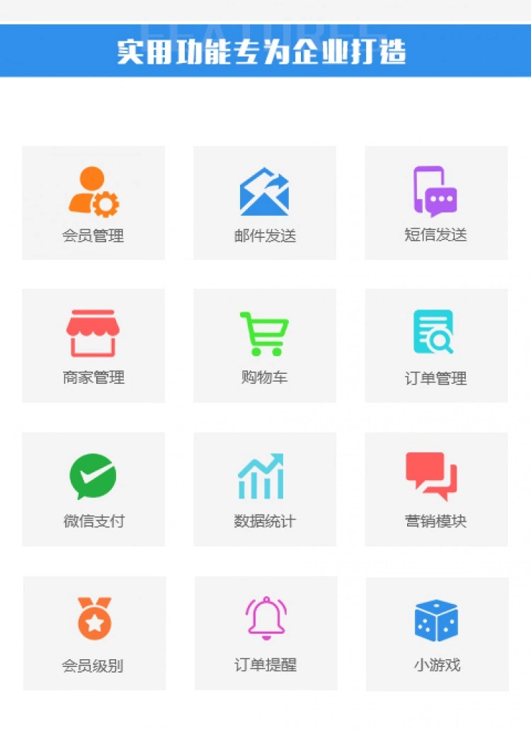 会员管理、邮件发送、短信发送、会员级别、微商品、购物车、订单管理、订单提醒、微信支付、数据魔方、营销模块、小游戏