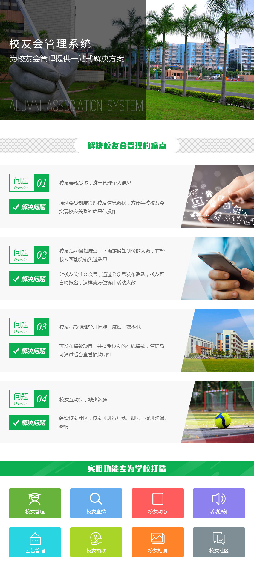 校友管理、校友查找、校友动态、活动通知、公告管理、校友相册、校友捐款、校友社区