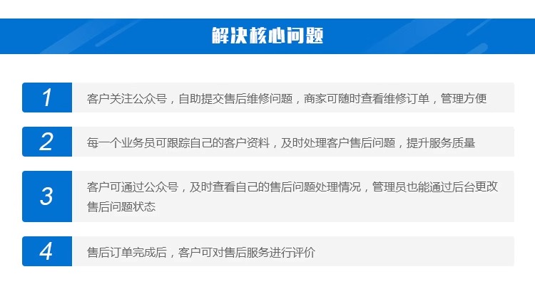 1、客户关注公众号,自助提交售后维修问题,商家可随时查看维修订单,管理方便。