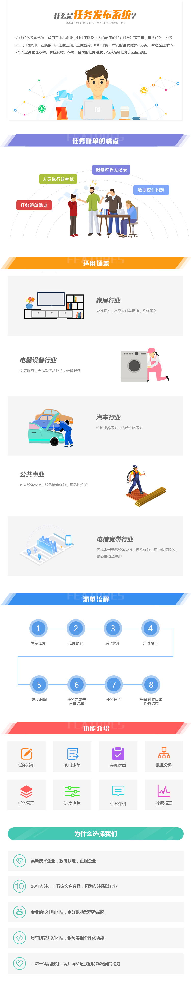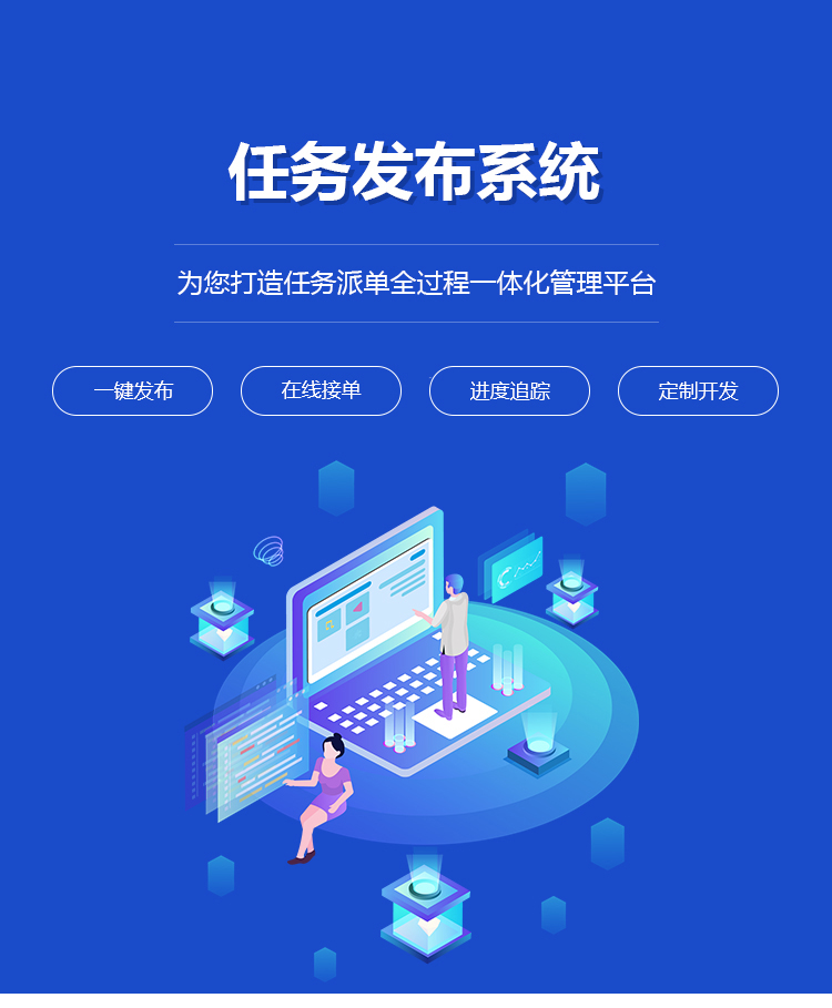 在线任务发布系统,适用于中小企业、创业团队及个人的使用的任务派单管理工具,是从任务一键发布、实时派单、在线接单、进度上报、进度查询、客户评价一站式的互联网解决方案,帮助企业/团队/个人提高管理效率、掌握及时、准确、全面的任务进度,有效控制任务实施全过程。