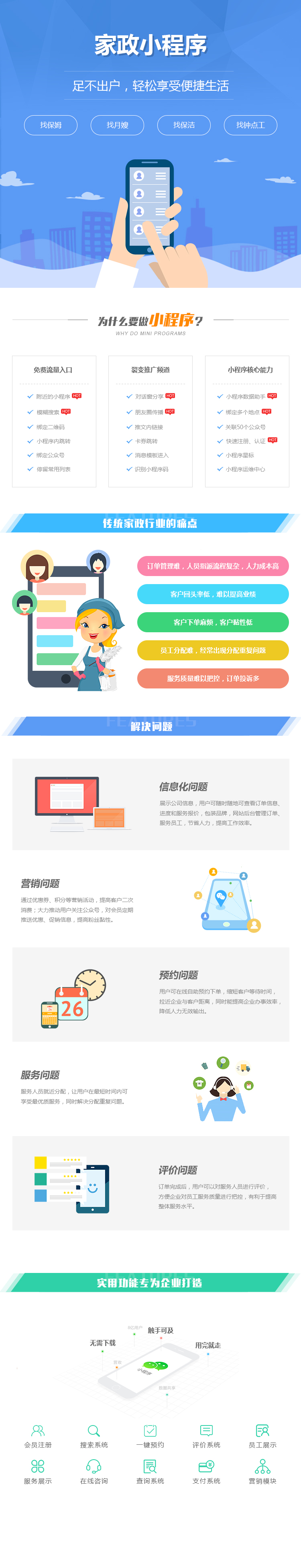 1、信息化问题:展示公司信息,用户可随时随地可查看订单信息、进度和服务报价,包装品牌,网站后台管理订单、服务员工,节省人力,提高工作效率。
