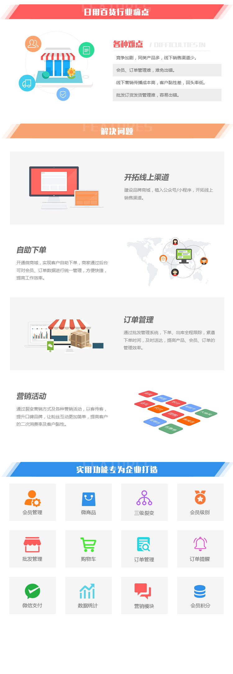 开通微商城,实现客户自助下单,商家通过后台可对会员、订单数据进行统一管理,方便快捷,提高工作效率。
