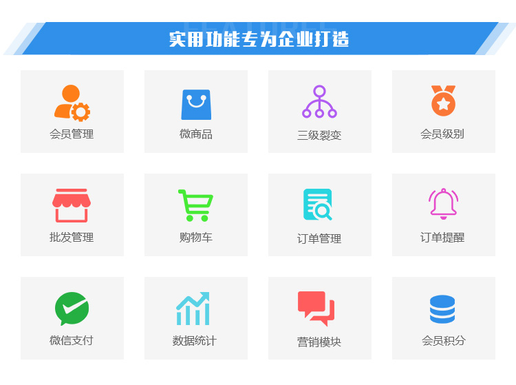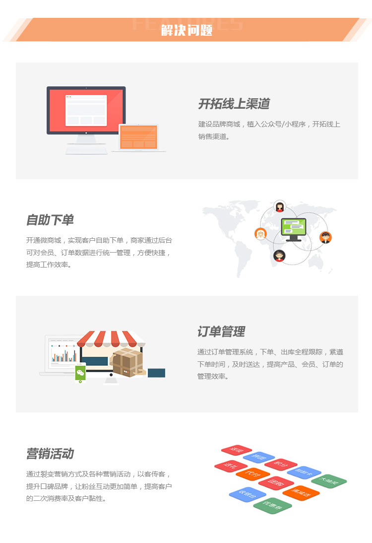 开通微商城,实现客户自助下单,商家通过后台可对会员、订单数据进行统一管理,方便快捷,提高工作效率。