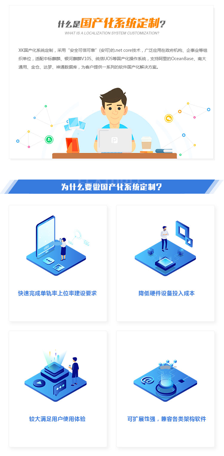 XK国产化系统定制,采用“安全可信可靠”(安可)的net core技术,广泛应用在政府机构、企事业等组织单位,适配中标麒麟、银河麒麟V10S、统信UOS等国产化操作系统,支持阿里的OceanBase、南大通用、金仓、达梦、神通数据库,为客户提供一系列的软件国产化解决方案。