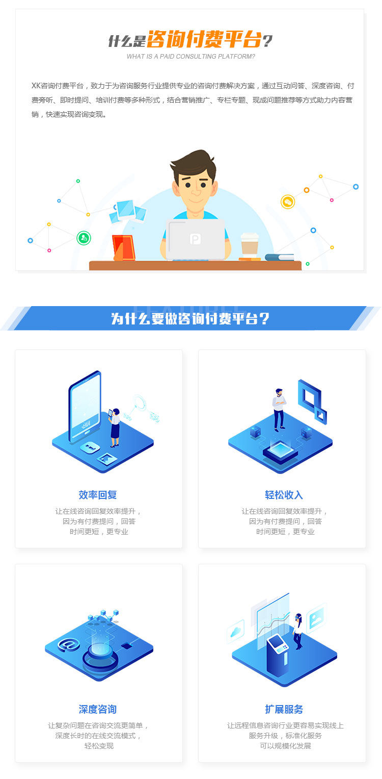 XK咨询付费平台,致力于为咨询服务行业提供专业的咨询付费解决方案,通过互动问答、深度咨询、付费旁听、即时提问、培训付费等多种形式,结合营销推广、专栏专题、现成问题推荐等方式助力内容营销,快速实现咨询变现。