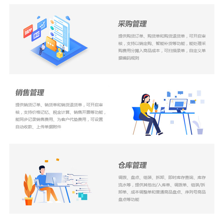 调拨、盘点、组装、拆卸、即时库存查询、库存流水等,提供其他出/入库单、调拨单、组装/拆卸单、成本调整单和普通商品盘点、序列号商品盘点等功能