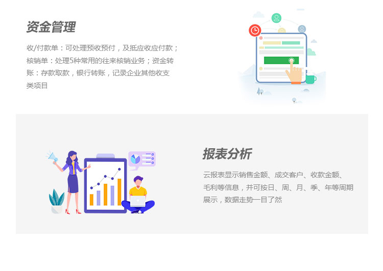 收/付款单:可处理预收预付,及抵应收应付款;核销单:处理5种常用的往来核销业务;资金转账:存款取款,银行转账,记录企业其他收支类项目