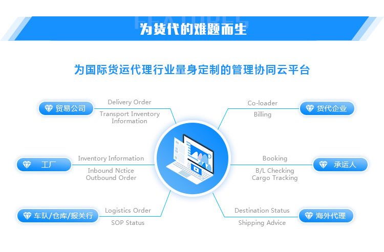 业务管理:支持海运出口业务、海运进口业务、空运出口业务、空运进口业务:支持整箱与拼箱业务。进口分拨业务、空运包板业务。业务模块有机集成,可根据您的业务需要自由搭配选购不同的模块。