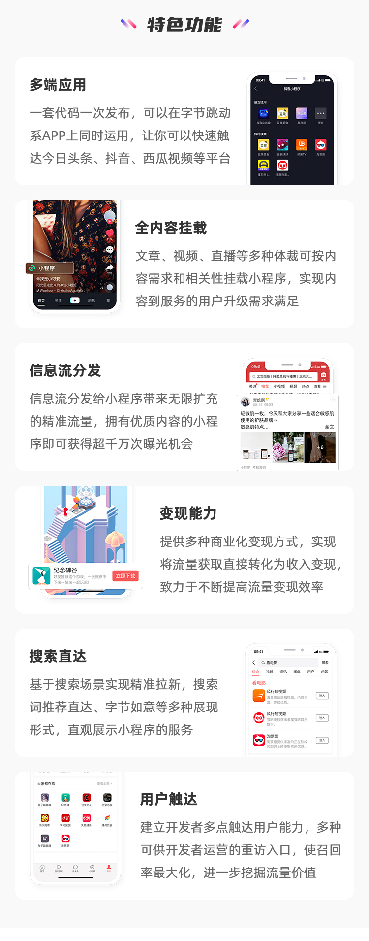 5、搜索直达:基于搜索场景实现精准拉新,搜索词推荐直达、字节如意等多种展现形式,强化小程序形态,直观展示小程序的服务。