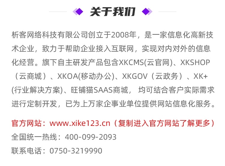 Product & Solution析客网络科技有限公司创立于2008年,是一家信息化高新技术企业,致力于帮助企业接入互联网,实现对内对外的信息化经营。旗下自主研发产品包含XKCMS(云官网)、XKSHOP(云商城)、XKOA(移动办公)、XKGOV(云政务)、XK+(行业解决方案)、旺铺猫SAAS商城, 均可结合客户实际需求进行定制开发,已为上万家企事业单位提供网站信息化服务。