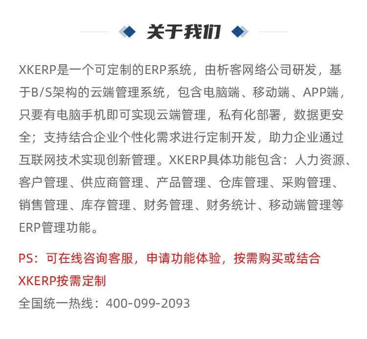 PS:可在线咨询客服,申请功能体验,按需购买或结合XKERP按需定制