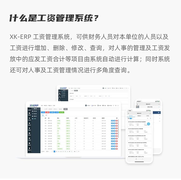 XK-ERP 工资管理系统,可供财务人员对本单位的人员以及工资进行增加、删除、修改、查询,对人事的管理及工资发放中的应发工资合计等项目由系统自动进行计算;同时系统还可对人事及工资管理情况进行多角度查询。