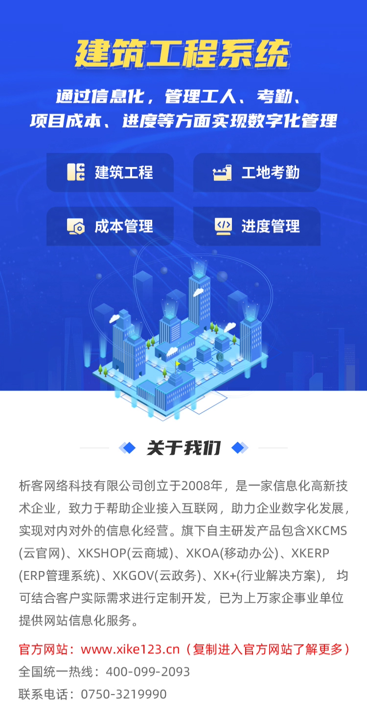 Product & Solution析客网络科技有限公司创立于2008年,是一家信息化高新技术企业,致力于帮助企业接入互联网,助力企业数字化发展,实现对内对外的信息化经营。旗下自主研发产品包含XKCMS(云官网)、XKSHOP(云商城)、XKOA(移动办公)、XKERP(ERP管理系统)、XKGOV(云政务)、XK+(行业解决方案), 均可结合客户实际需求进行定制开发,已为上万家企事业单位提供网站信息化服务。