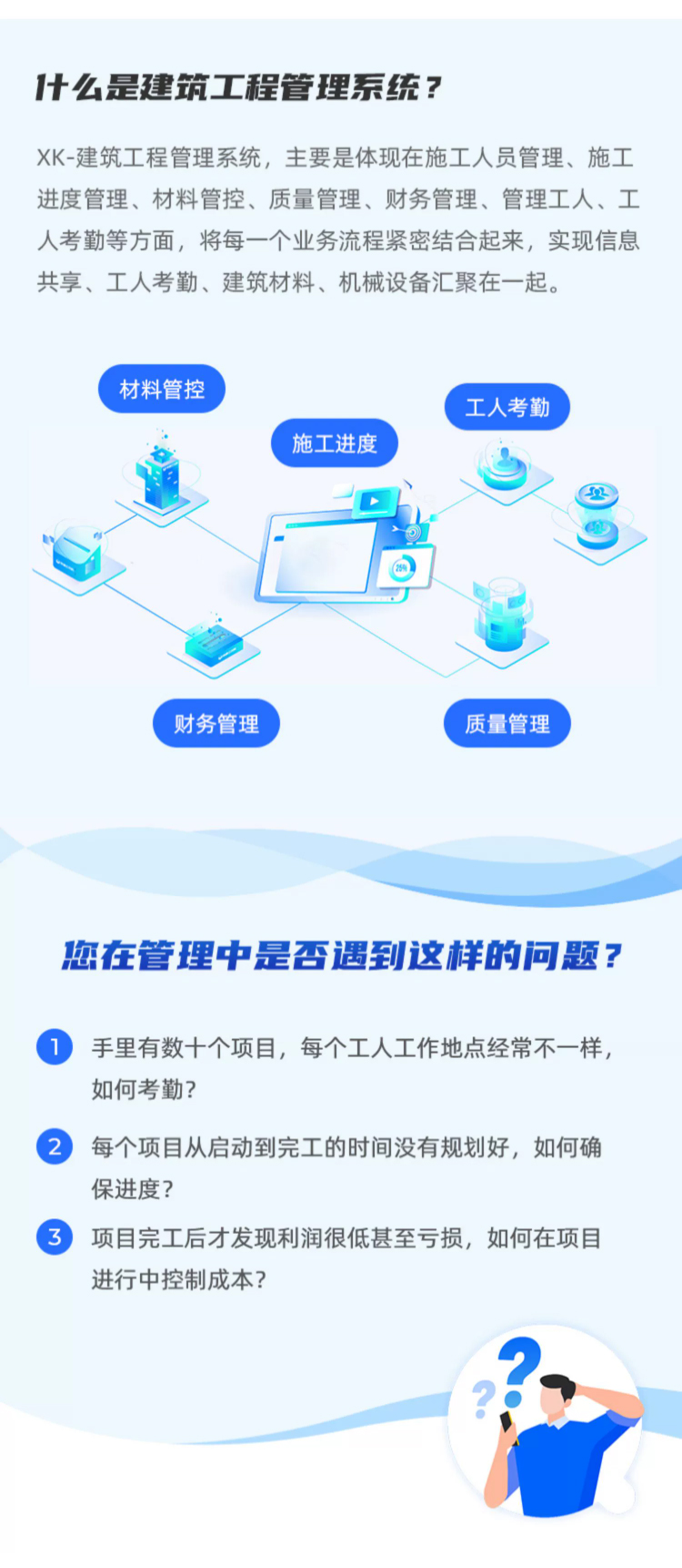 XK-建筑工程管理系统,主要是体现在施工人员管理、施工进度管理、材料管控、质量管理、财务管理、管理工人、工人考勤等方面,将每一个业务流程紧密结合起来,实现信息共享、工人考勤、建筑材料、机械设备汇聚在一起。