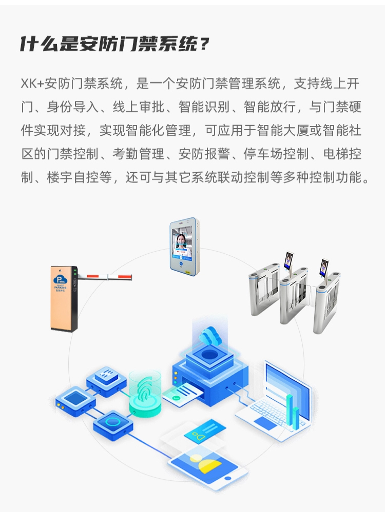 XK+安防门禁系统,是一个安防门禁管理系统,支持线上开门、身份导入、线上审批、智能识别、智能放行,与门禁硬件实现对接,实现智能化管理,可应用于智能大厦或智能社区的门禁控制、考勤管理、安防报警、停车场控制、电梯控制、楼宇自控等,还可与其它系统联动控制等多种控制功能。