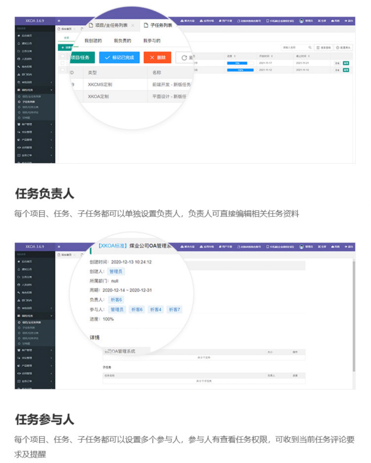 4、任务参与人:每个项目、任务、子任务都可以设置多个参与人,参与人有查看任务权限,可收到当前任务评论要求及提醒;